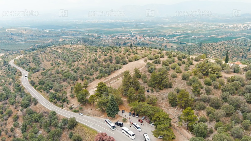 Место раскопок: Греческое поселение 12-го века до н.э. с руинами акрополя, дворца и гробниц, вид из воздуха