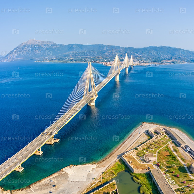 Рион, Греция.Рион - это Андрион.Дорожный и пешеходный мост через Коринфский залив.Летний день.Вид с воздуха