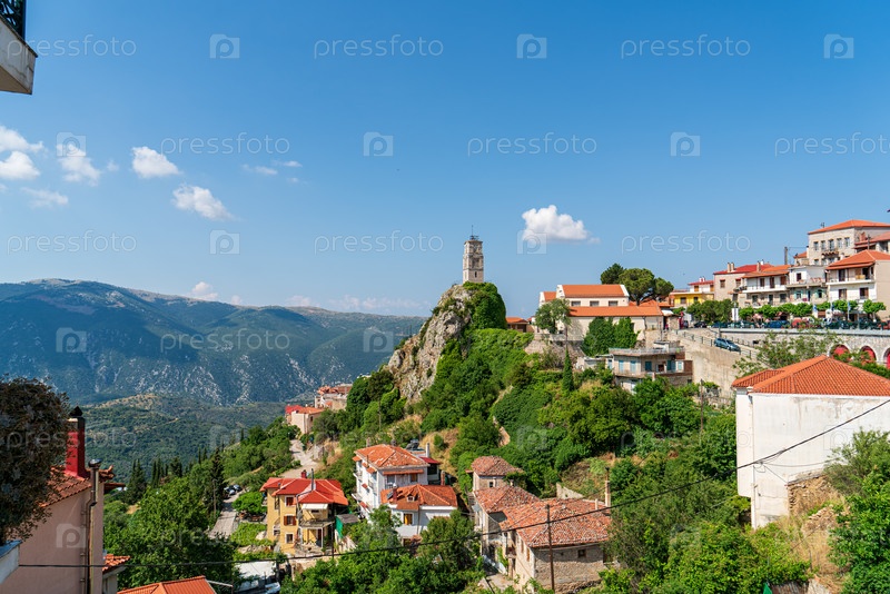 Арахова, Греция. Араховская часовая башня. Летний день