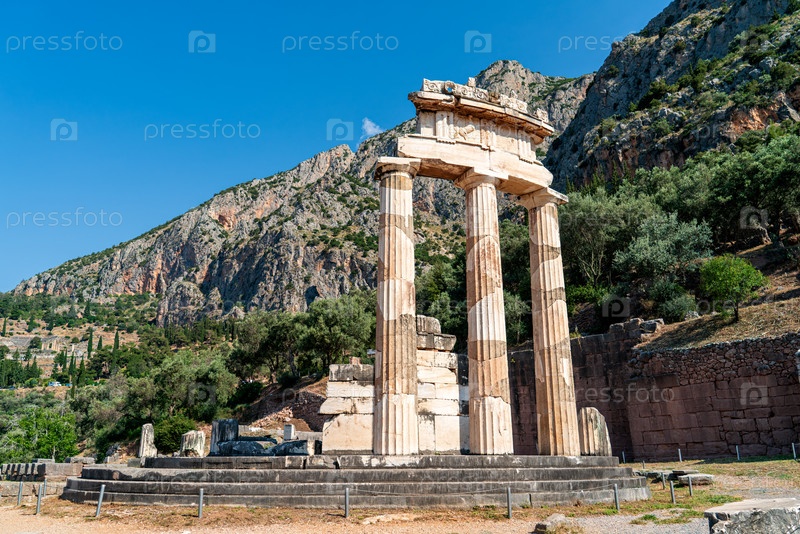 Дельфы, Греция. Толос Афина Пронаяя. Руины древнего города. Летний день