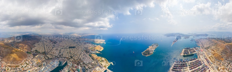 Афины, Греция. Грузовой порт. Контейнерный корабль в доке. Лето. Панорама 360