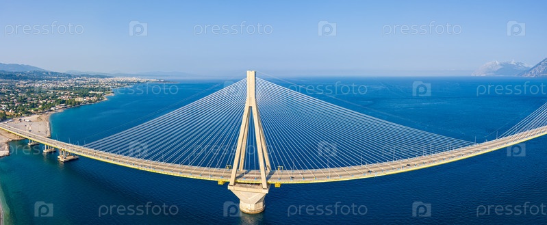 Рион, Греция.Рион - это Андрион.Дорожный и пешеходный мост через Коринфский залив.Летний день.Вид с воздуха