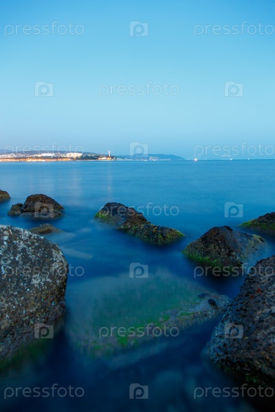 Геленджикский маяк в вечернее сумерки.Светы маяка отражаются в воде.Маяк стоит на высокой скале.На переднем плане есть камни в воде, покрытые водорослями