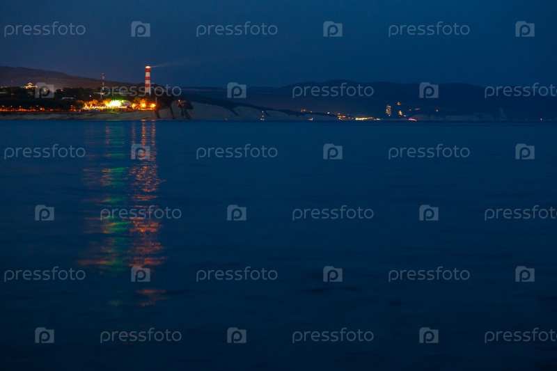 Геленджикский маяк в вечернее сумерки.Светы маяка отражаются на воде.Маяк стоит на высокой скале