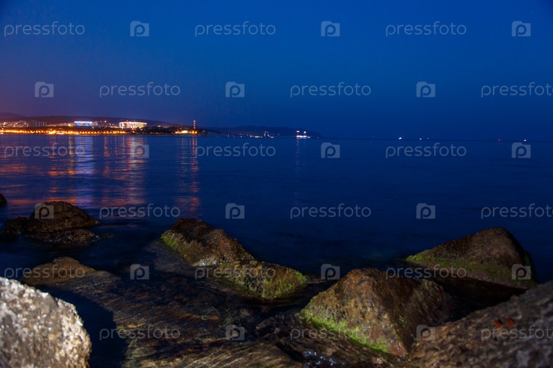 Геленджикский маяк в вечернее сумерки.Светы маяка отражаются в воде.Маяк стоит на высокой скале.На переднем плане есть камни в воде, покрытые водорослями