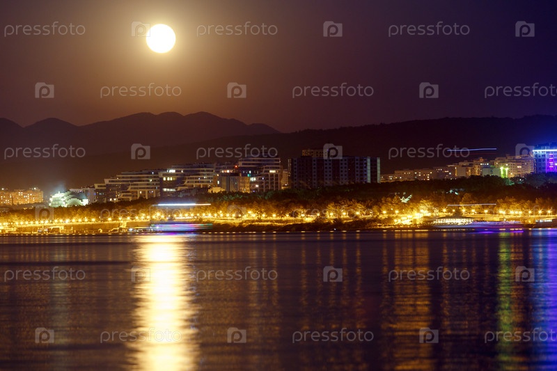 Геленджикский курорт ночью под лунным светом.Огни, отражающиеся в геленджикском заливе.Кавказские горы на заднем плане
