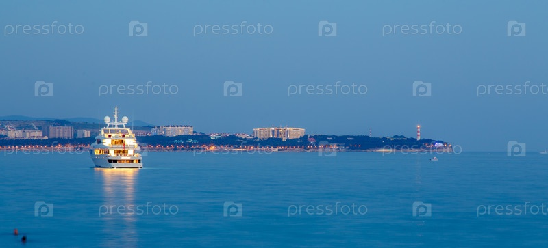 Геленджик курорт. сумерки сегодня вечером, успокойтесь. большая белая яхта расположена в геленджикской бухте. на фоне геленджикского маяка. свет отражается в воде