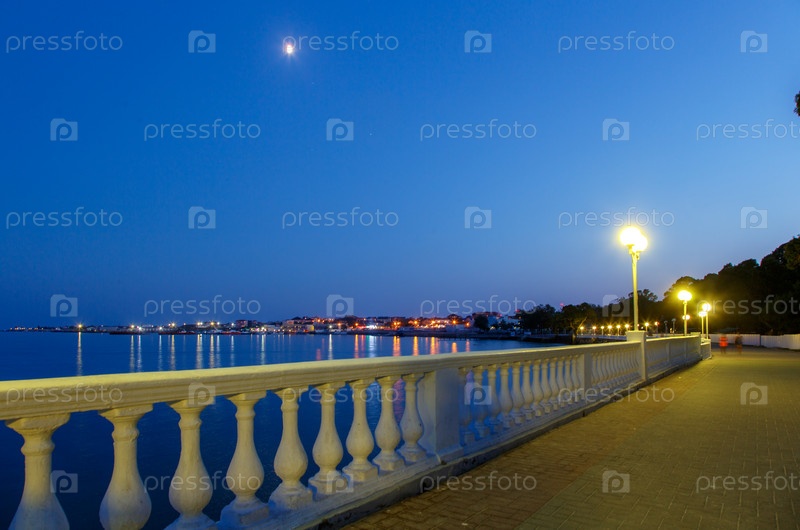 Геленджикский курорт в вечернее сумерки. Белая балюстрада, набережная. Светы города отражаются в воде залива Geledžik