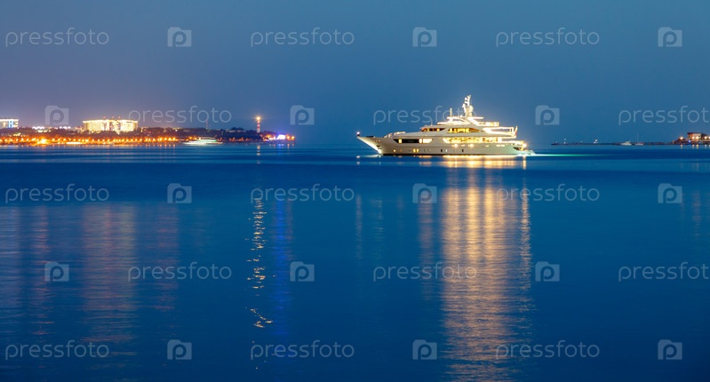 Геленджик курорт. сумерки сегодня вечером, успокойтесь. большая белая яхта расположена в геленджикской бухте. на фоне геленджикского маяка. свет отражается в воде