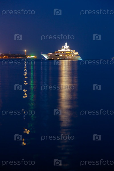 Геленджик курорт. сумерки сегодня вечером, успокойтесь. большая белая яхта расположена в геленджикской бухте. на фоне геленджикского маяка. свет отражается в воде
