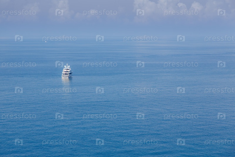 Большая белая яхта на гладких водах Черного моря. Гележик Курорт. Спокойствие. Яркие белые облака