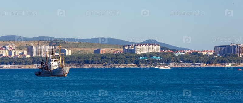 Рыболовная лодка стоит в Геленджикском заливе на фоне города Геленджик