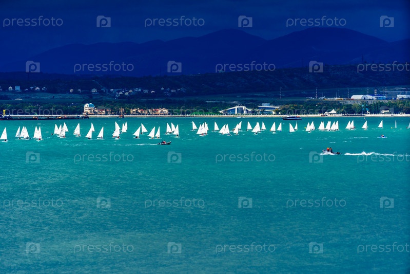 Молодежная яхтенная регата в Геленджикском заливе осеннее темное небо, зеленое бурное море горы и дома на заднем плане геленджик черное море