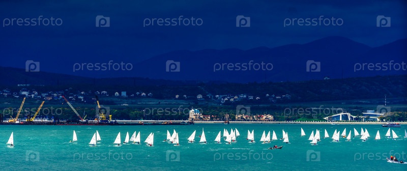 Молодежная яхтенная регата в Геленджикском заливе осеннее темное небо, зеленое бурное море горы и дома на заднем плане геленджик черное море
