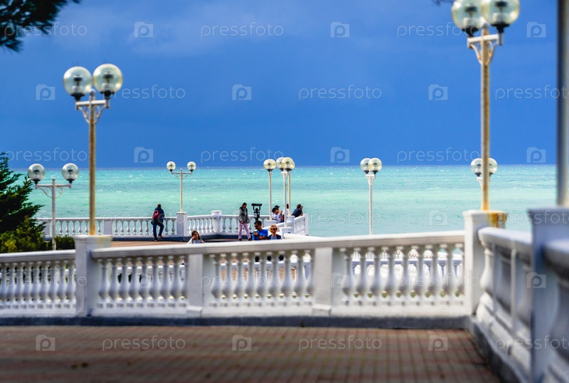 Набережная курортного города осенью. Набережная с балюстрадой и многочисленными фонарями. Зеленое море и темное, бурное небо. Люди гуляют вдоль набережной и смотрят к морю. Курорт Геленджик, Черное море