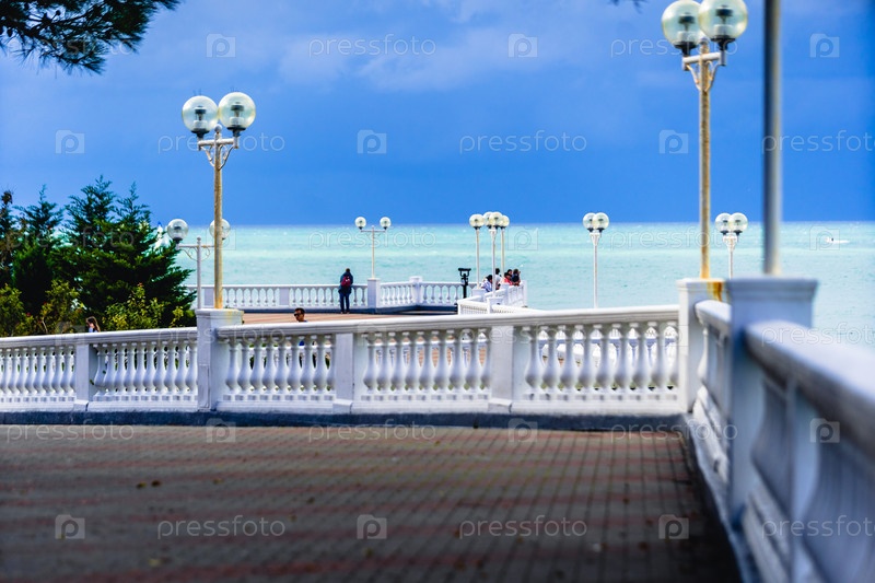 Набережная курортного города осенью. Набережная с балюстрадой и многочисленными фонарями. Зеленое море и темное, бурное небо. Люди гуляют вдоль набережной и смотрят к морю. Курорт Геленджик, Черное море