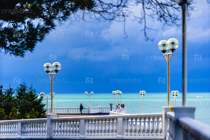 Набережная курортного города осенью. Набережная с балюстрадой и многочисленными фонарями. Зеленое море и темное, бурное небо. Люди гуляют вдоль набережной и смотрят к морю. Курорт Геленджик, Черное море