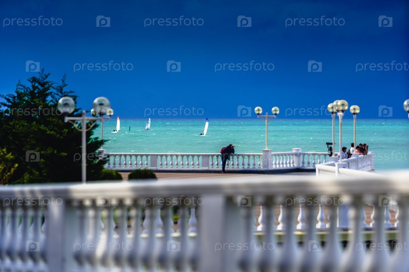 Набережная курортного города осенью, белая балюстрада. Люди смотрят на парусную регату в зеленом бурном море. Темное бурное небо. Солнце освещает набережную. Курорт Геленджик, Черное море