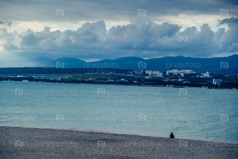 В вечернее сумерки человек сидит один на берегу Геленджикского залива.Кавказские горы на горизонте