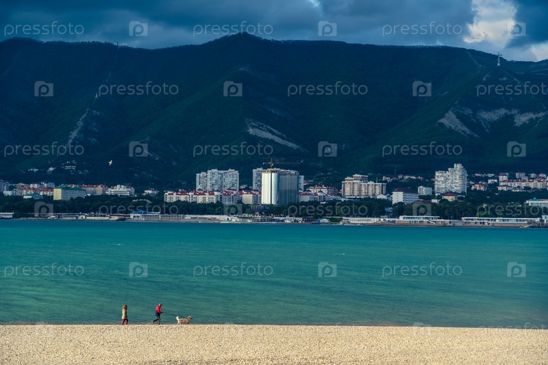 Курорт Геленджик.Закат солнца Мужчина и женщина с собакой гуляют на пляже залива Геленджик на фоне Кавказских гор