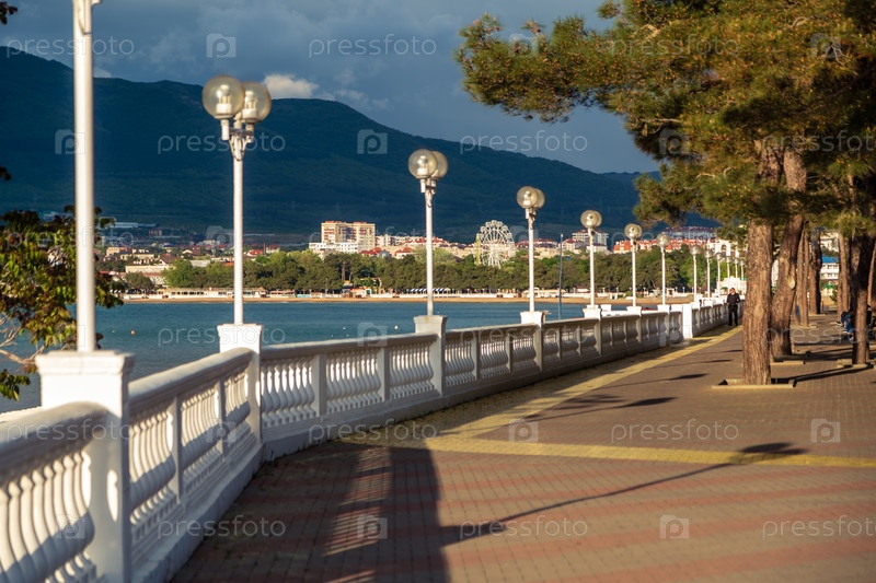 Город Геленджик. Курортная набережная с балюстрадой и фонарями. Сосна Пицунда. На заднем плане - залив Геленджик и Кавказские горы