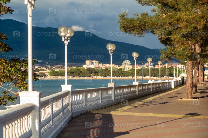 Город Геленджик. Курортная набережная с балюстрадой и фонарями. Сосна Пицунда. На заднем плане - залив Геленджик и Кавказские горы