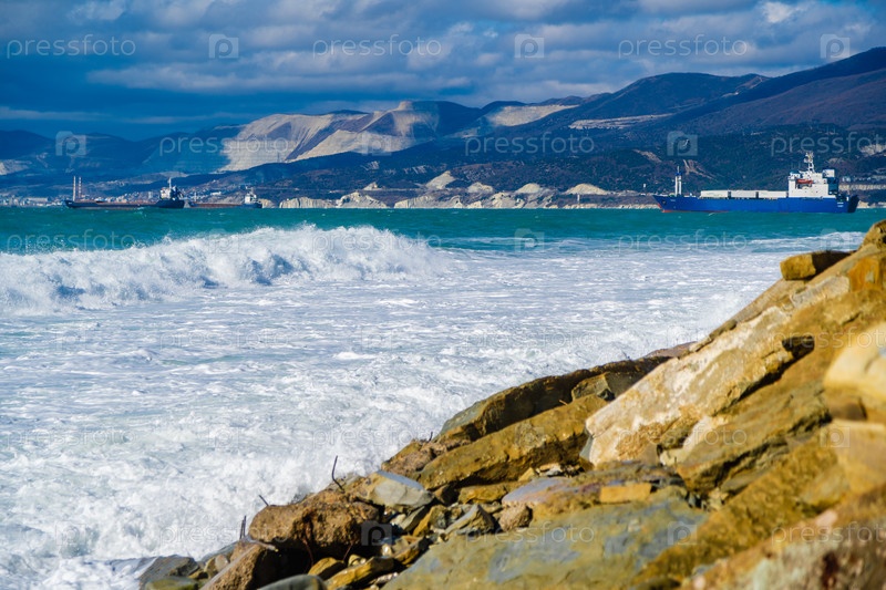 Большие зеленые штормовые волны в белой пены прокатываются по скалистому пляжу Кабардинки.На заднем плане - порт Новороссийск и Кавказские горы