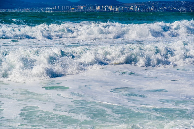 Большие зеленые штормовые волны в белой пены прокатываются по скалистому пляжу Кабардинки.На заднем плане - порт Новороссийск и Кавказские горы