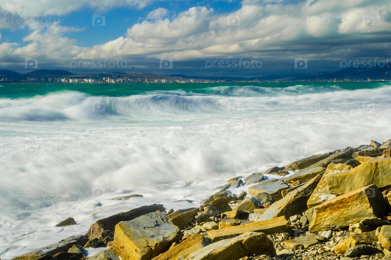 Курорт 'Кабардинка'.Большие зеленые штормовые волны в белой пены.На заднем плане порт Новороссийск и Кавказские горы.Огромные скалы на берегу.Фото длинной выставки