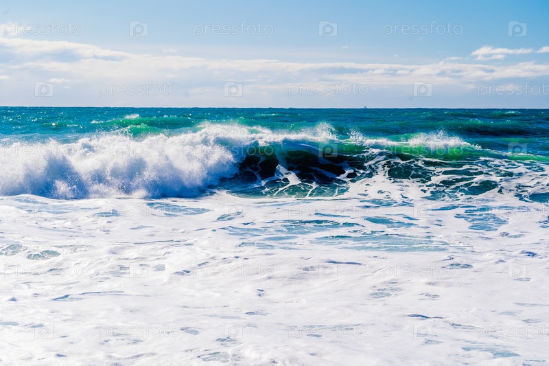 Курорт 'Кабардинка'.Черное море.Большие штормовые волны изумрудного цвета пролетают к берегу.Множество спреев и пены