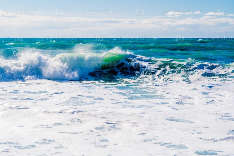 Курорт 'Кабардинка'.Черное море.Большие штормовые волны изумрудного цвета пролетают к берегу.Множество спреев и пены