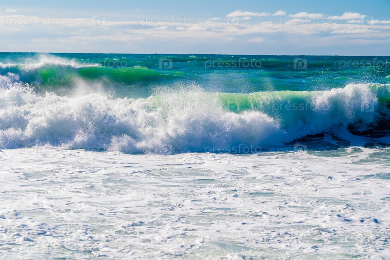 Курорт 'Кабардинка'.Черное море.Большие штормовые волны изумрудного цвета пролетают к берегу.Множество спреев и пены