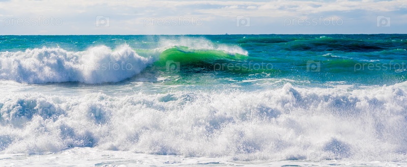Курорт 'Кабардинка'.Черное море.Большие штормовые волны изумрудного цвета пролетают к берегу.Множество спреев и пены