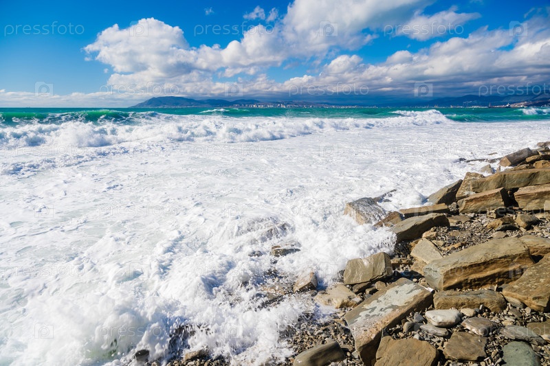 Кабардинский курорт. большие зеленые штормовые волны в белой пены прокатываются по скалистому пляжу Кабардинки. на заднем плане порт Новороссийск и Кавказские горы. огромные камни на берегу. вспышки и пена от волн