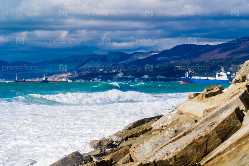 Кабардинский курорт.Большие зеленые штормовые волны в белой пены прокатываются по скалистому пляжу Кабардинки.На заднем плане - порт Новороссийск и Кавказские горы.Корабли на рейде к порту