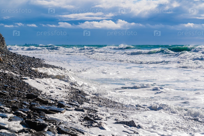 Курорт 'Кабардинка'.Черное море.Большие штормовые волны изумрудного цвета пролетают к берегу.Множество спреев и пены