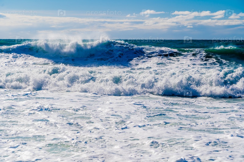 Курорт 'Кабардинка'.Черное море.Большие штормовые волны изумрудного цвета пролетают к берегу.Множество спреев и пены