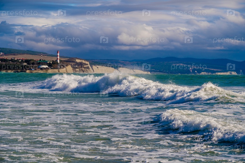 Большие зеленые штормовые волны прокатываются на фоне геленджикского маяка.Маяк стоит на высокой скале