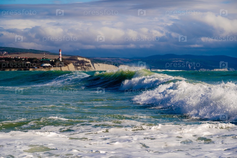 Большие зеленые штормовые волны прокатываются на фоне геленджикского маяка.Маяк стоит на высокой скале