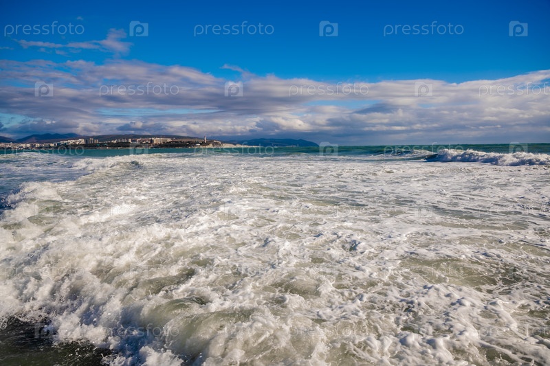 Большие зеленые штормовые волны прокатываются на фоне геленджикского маяка.Маяк стоит на высокой скале