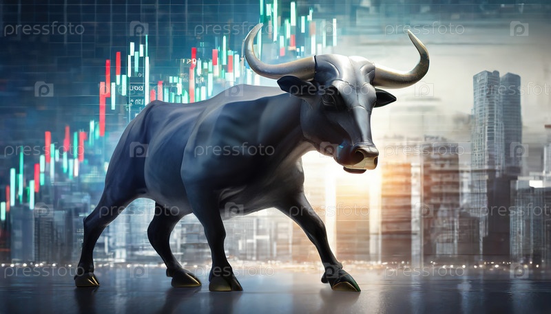 Мощная статуя быка в городском пейзаже с диаграммами фондового рынка и наложением финансовых данных