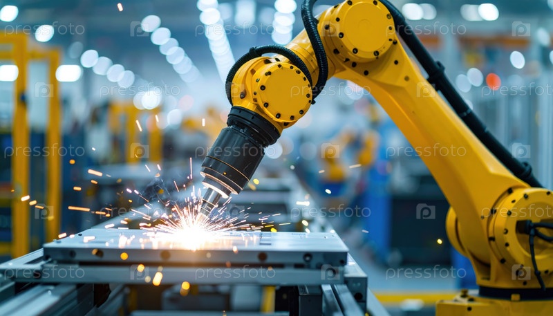Промышленная робототехническая рука сварит металл на автоматизированной производственной линии, подчеркивая передовое производство и прецизионный дизайн на фабрике