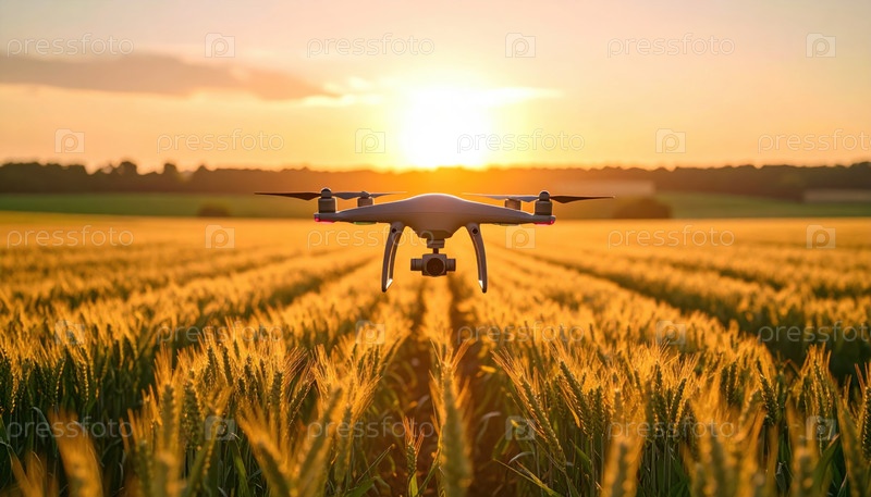Дрон летает низко над золотым пшеничным полем на закате, символизируя современное сельское хозяйство и интеллектуальные технологии сельского хозяйства для мониторинга урожаев