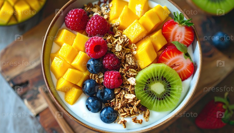 Здоровый завтрак с йогуртом, гранолой, манго, ягодами, киви и клубникой на деревянном столе