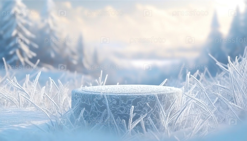 Замерзший, морозный пьедестал в снежном поле, окруженный ледяной травой, с безмятежным зимним пейзажем на расстоянии