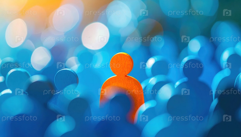 Оранжевая фигура выделяется среди синих символов толпы, представляющих индивидуальность, уникальность, лидерство и идентичность в современном обществе или маркетинге