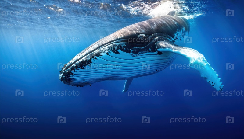 Горбатый кит скользит под водой вблизи поверхности океана, фильтруя солнечный свет