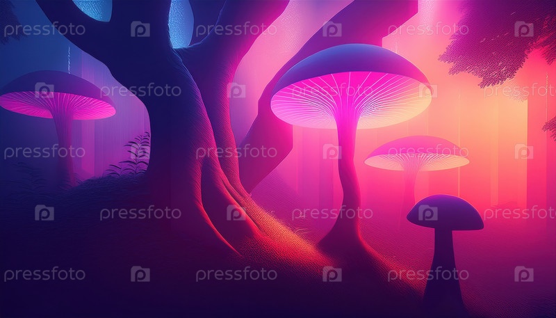 Сияющие грибы в сюрреалистическом неоновом лесу создают яркую атмосферу фантазии тайны и удивления