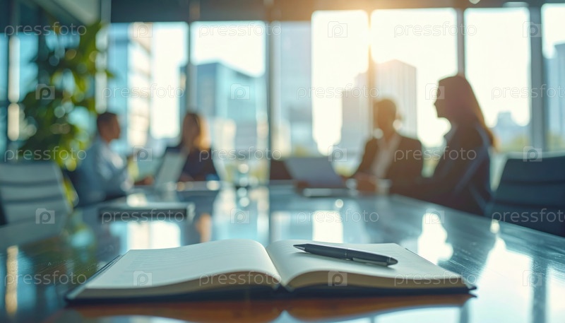 Корпоративная среда встреч с акцентом на блокнот и ручку во время деловых обсуждений в зале за стеклянными стенами