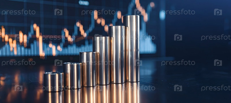Цилиндры из нержавеющей стали представляют рост промышленного производства с абстрактным финансовым графиком, символизирующим экономическую тенденцию и развитие